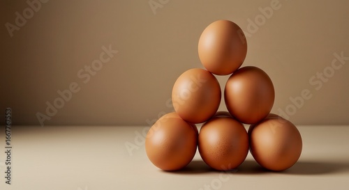 Organic brown eggs arranged in minimalist pyramid on warm beige – wholesome farm-fresh concept for food brands in detailed 8K.