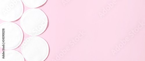 organic cotton pads on pink background. Zero waste, reusable, eco, makeup remover and washing concept. pattern, hard light, flat lay, copyspace, banner