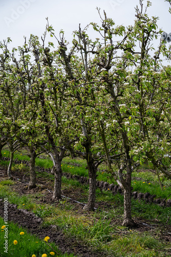 Organic farming in Netherlands, rows of blossoming conference pear trees on fruit orchards in Betuwe, Gelderland