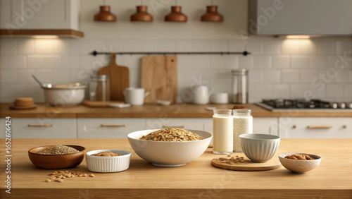 Organic granola concept ,Soft neutral kitchen setting with granola preparation, featuring bowls of ingredients and milk