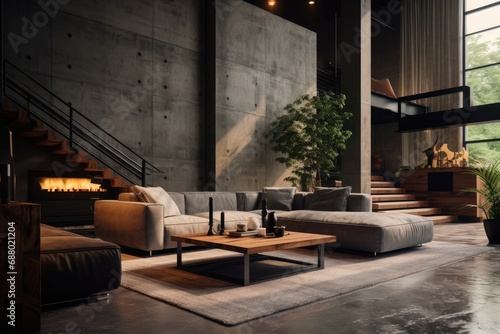organic, industrial design, living room, natural light, modern, contemporary, furniture, sofa, bookshelf, coffee table, rug, window, plant, concrete, wood, cosy, comfortable, stylish, trendy, home decor, interior design, architecture, roomy, airy, bright, minimalist, chic, elegant, luxury, high-end, sophisticated, urban, loft, rustic