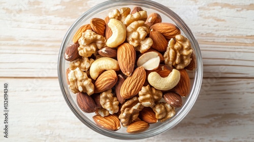 Organic Mixed Nuts in a Clear Glass Bowl on Light Wooden Surface with Natural Light Highlighting Rich Textures and Colors.