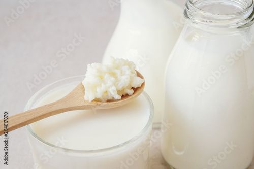 Organic probiotic milk kefir grains, Tibetan mushrooms on wooden spoon and kefir milk in glass containers