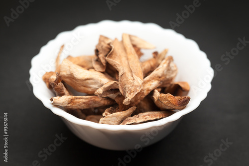 Organic Sour dried mango or Aamchur or Amchoor (Mangifera indica) in white ceramic bowl on dark background.