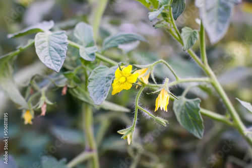 Organic tomatoes are grown in a greenhouse. Yellow flowers. Vegetables in flowering season.