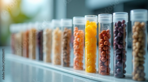 Organized Colorful Candy and Snacks in Clear Test Tubes on Laboratory Shelf