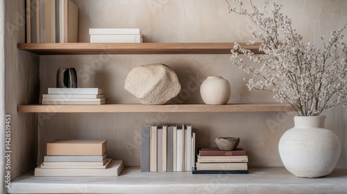 Organized shelves with soft tones, stacked books, and a matte-finished sculpture that adds minimalist depth
