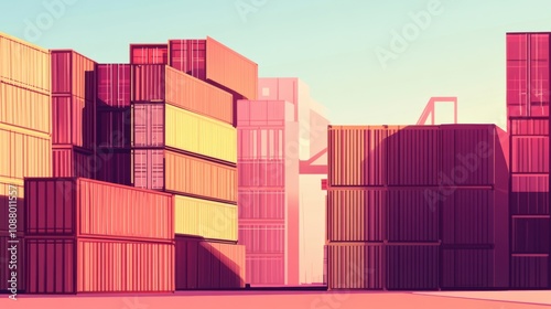 container, design, illustration, flat, stacked, row, muted, colours, organised, port, setting, cargo, shipping, industry, transport, geometric, modern, structure, gradient, abstract, detail, architecture, background, pattern, scenery, visual, creative, artwork, minimal, aesthetic, colourful, environment, layout, space, urban, scene, graphic, element, composition, tabletop, display, perspective, tone, shape