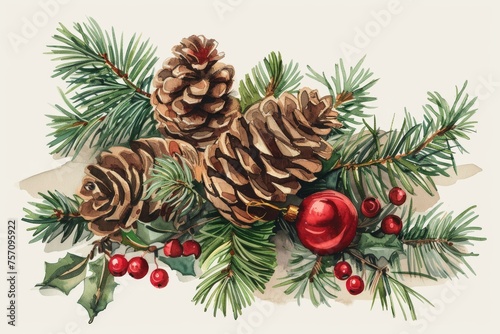 Original composition of branches, cones and Christmas balls for the design of a postcard or invitation.