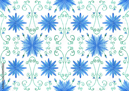 flower, illustration, floral, decoration, nature, blue, pattern, plant, spring, green, ornate, seamless, ornament, summer, blossom, design, beauty, wallpaper, botany, decor, tracery, burgeon, bloom, watercolor, floret, growth, periodical, white background