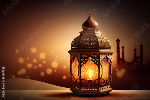 Ornamental Arabic lantern with burning candle glowing Ramadan Kareem made with Generative AI