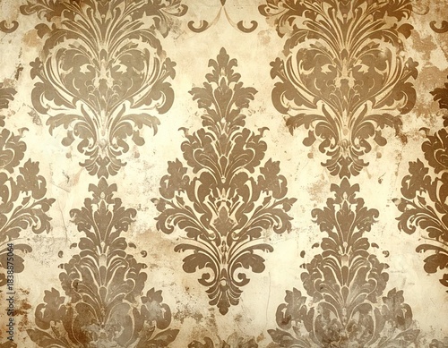 wallpaper, damask, baroque, ornate, texture, aged, brown, pattern, vintage, design, background, floral, decorative, repeating, classic, elegant, detailed, intricate, surface, wall, material, paper, rococo, antique, old, beige, sepia, neutral, fabric, textile, ornament, element, motif, style, formal, luxurious, refined, graceful, rich, lavish, ornamental, template, graphic, interior, decoration, covering, damaged