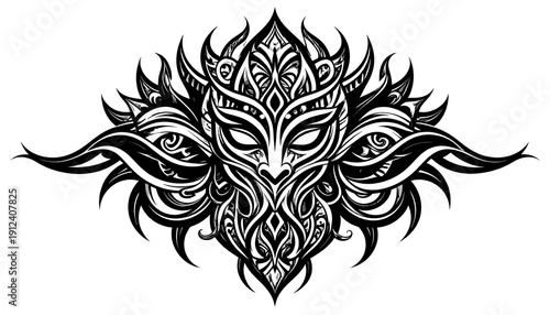 mask, ornate, face, tribal, symmetric, design, line, pattern, black, white, art, illustration, detail, stylised, radiant, intricate, swirl, abstract, graphic, aesthetic, elegant, mysterious, cultural, symbol, spiritual, decorative, fantasy, celestial, expression, unique