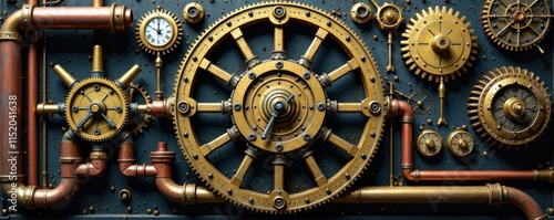 Ornate brass gears, copper pipes, intricate clockwork , valves, machine