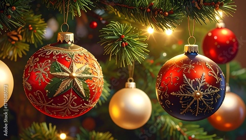 Ornate Christmas ornaments, showcasing festive colors and intricate designs, are hung on a Christmas tree, bathed in warm, inviting light.