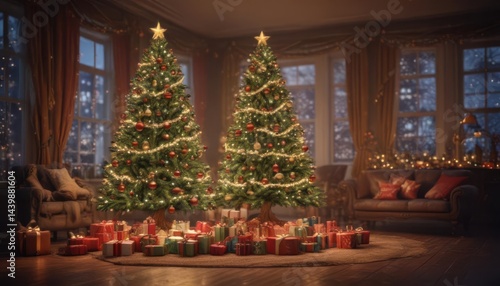 Ornate Christmas tree, vibrant lights, abundant gifts , winter wonderland, holiday spirit