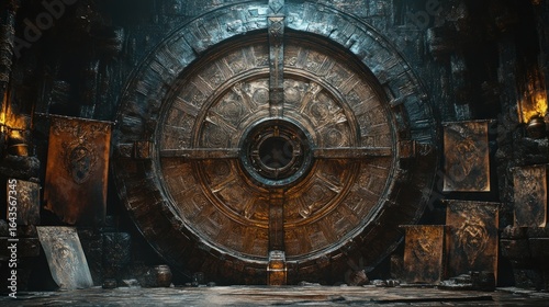 Ornate Circular Doorway in a Dark, Stone Chamber