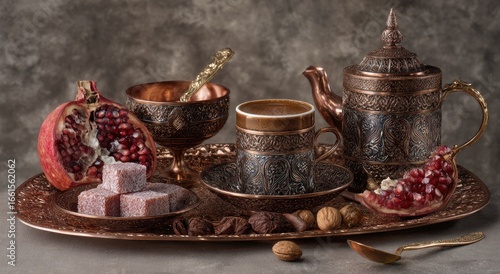 copper, hot drink, tea, pomegranate, sweet, turkish, dessert, nut, tray, cup, pot, vintage, still, life, fruit, delicious, ornament, decorative, metal, drink, arrangement, serving, luxury, elegant, tradition, ancient, dark, background, stone, texture, still life, food, healthy, epicure, artisanal, composition, detail, closeup, studio, shot, photo, beautiful, classic, display, object, tasty