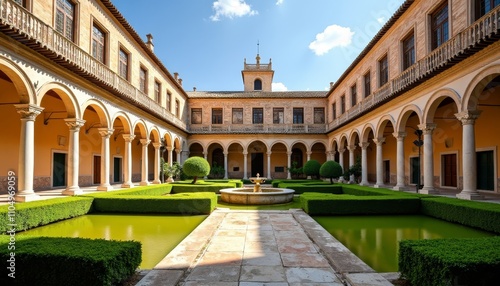 building, yellow, courtyard, pool, pillar, castle, fountain, stone, tree, hedge, paseo, grass