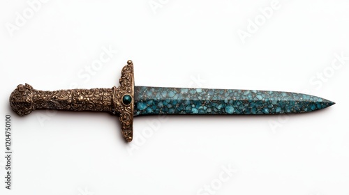 dagger, knife, sword, turquoise, inlay, weapon, ancient, ornate, metal, blade, handle, antique, historical, collectable, jewellery, gemstone, blue, green, decorative, art, craft, hand-made, luxury, vintage, elegant, royals, precious, sharp, pointy, detailed, intricate, background, white background, isolated, object, still life, closeup, hi-res, photo, image, royalty free, no people, studio shot