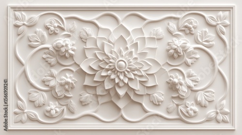 floral, design, decorative, panel, wall, relief, carving, embossed, ornament, pattern, art, texture, three-dimensional, white, decor, home, interior, exterior, architecture, classic, vintage, luxury, elegant, style, motif, symmetry, detail, sculpted, lotus, flower, leaf, scroll, frame, border, patterned, refined, ornate, ceiling, room, molding, cream, render, illustration, artwork, print, furniture