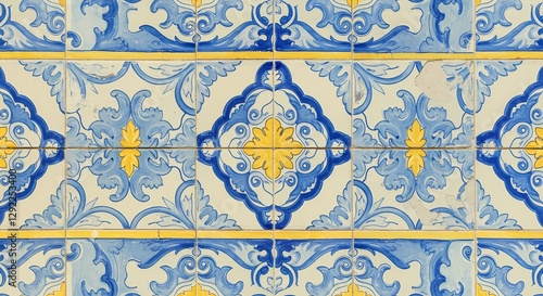 Ornate Decorative Tiles Blue Yellow Floral Design Traditional Pattern