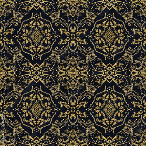 Ornate golden damask pattern on dark navy background with vintage floral elements, seamless pattern, royalty stock.