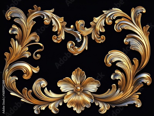 gold, ornate, floral, scrollwork, leaf, decorative, design, elegant, detailed, curve, baroque, luxury, pattern, metallic, artistic, vintage, classic, flourish, embellishment, decoration, stylised, texture, shiny, glossy, ornament, swirl, frame, curvilinear, rich, elegance, antique, sophisticated, beauty, ornamentation, craftsmanship, artwork, luxurious, stylish, complex, patterned, symmetric, fine art, glimmer, bright, black background