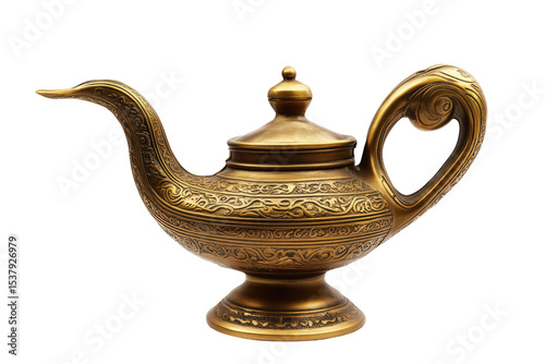 Ornate Golden Genie Lamp with Intricate Engravings isolated on transparent white background, clipping path