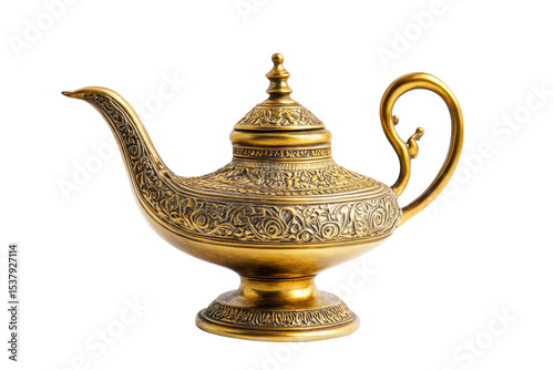 Ornate Golden Genie Lamp with Intricate Engravings isolated on transparent white background, clipping path
