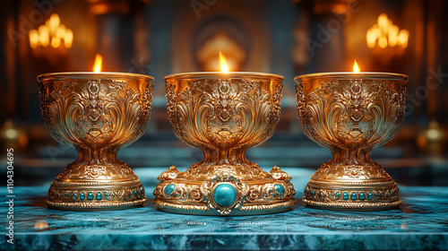 Ornate golden goblets with candles on marble surface in luxurious setting