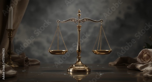 justice, scale, balance, law, fairness, legal, equilibrium, judgement, decision, truth, equity, order, measurement, comparison, weighing, arbitration, court, jurisprudence, ethic, right, wrong, dilemma, choice, resolution, integrity, morality, wisdom, legal system, advocacy, professional, symbolic, abstract, conceptual, antique, vintage, gold, metallic, dark background, studio shot, elegant, sophisticated, refined, polished, ornate, detailed, classical, still life