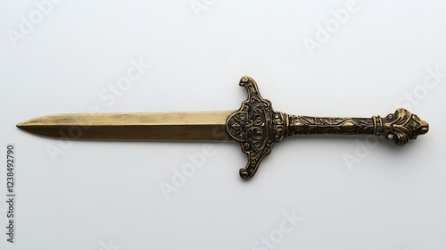 dagger, metal, ornate, carving, detail, blade, hilt, handle, gold, weapon, decorative, intricate, closeup, overhead, shot, background, white, object, item, antique, vintage, style, design, art, craft, history, museum, collection, display, slender, pointed, sharp, metallic, gold, hue, texture, surface, image, photo, picture