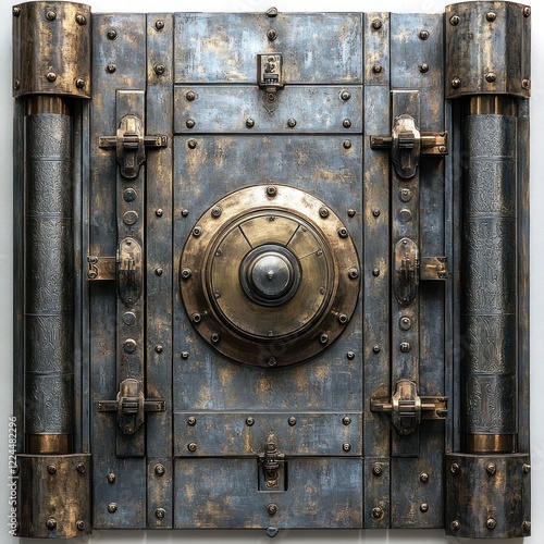 metal, door, vault, antique, security, rust-eaten, old, vintage, brass, steel, industrial, gear, mechanism, bolt, rivet, lock, hinge, design, texture, pattern, weathered, complexity, intricate, craftsmanship, heavy, strong, dark, grey, brown, ornate