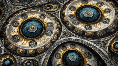pattern, design, ornate, metallic, circular, decorative, background, intricate, repeating, texture, abstract, geometric, art, fractal, digital, graphic, wallpaper, metal, gold, silver, blue, eye, symmetry, detail, complex, vintage, illustration, fantasy, ornament, pattern, image, modern, futuristic, three-dimensional, technology, floral