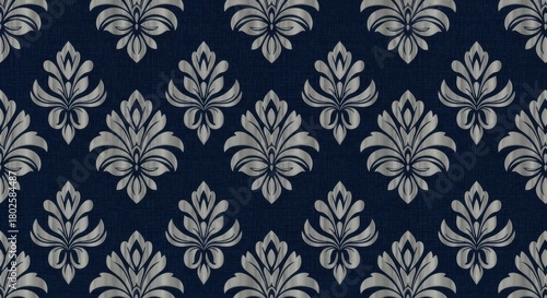 Ornate silver floral motif repeats seamlessly across a deep blue textured background