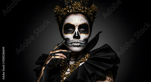 Ornate Skull Makeup: Dark Queen with Golden Crown and Ruffles.