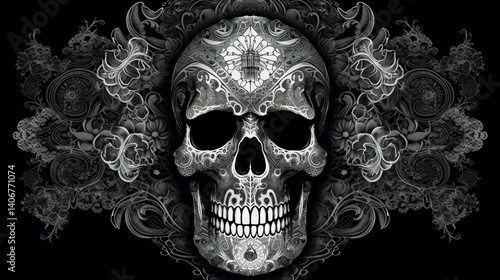 skull, ornate, floral, pattern, decorative, death, gothic, halloween, sugar, skeleton, black, white, monochrome, design, vintage, retro, art, tattoo, illustration, ornament, graphic, fantasy, grisly, dark, skittish, horror, scarey, evil, dead, bone, bone, head, face, jaw, teeth, flower, swirl, baroque, detailed, victorian, elegant, stylish, intricate, complex, fancy, artistic