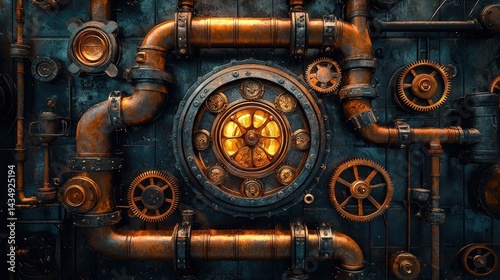 mechanical, intricate, brass, copper, pipe, gear, cog, wheel, design, futuristic, technology, machinery, panel, wall, metal, industrial, background, texture, pattern, detail, artistry, element, artwork, illustration, graphic, art, image, display, structure, system, mechanism, component, assembly, collection, concept, aesthetic, vintage, retro, glowing, circle, circular, center, illuminated, warm, gold, orange