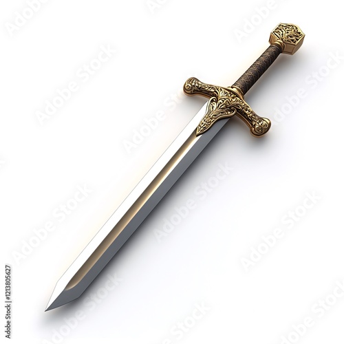 sword, ornate, fantasy, weapon, mediaeval, game, design, isolated, white, background, battle, combat, knight, king, power, royalty, ancient, history, metal, steel, gold, blade, sharp, edge, handle, grip, warrior, fight, victory, courage, strength, bequest, heritage, legend, myth, culture, artifact, object, illustration, graphic, image, three-dimensional, render, model, art, dagger, knife, war, military