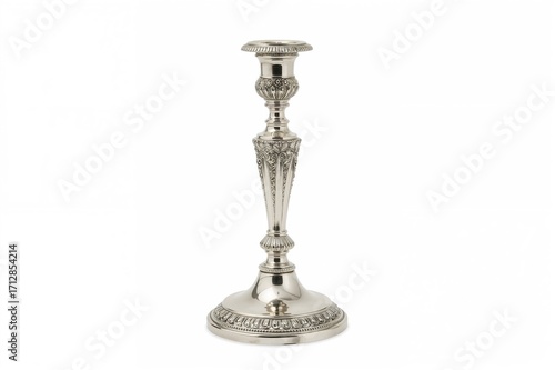 Ornate vintage silver candle holder with decorative details, isolated on a white backdrop, front perspective