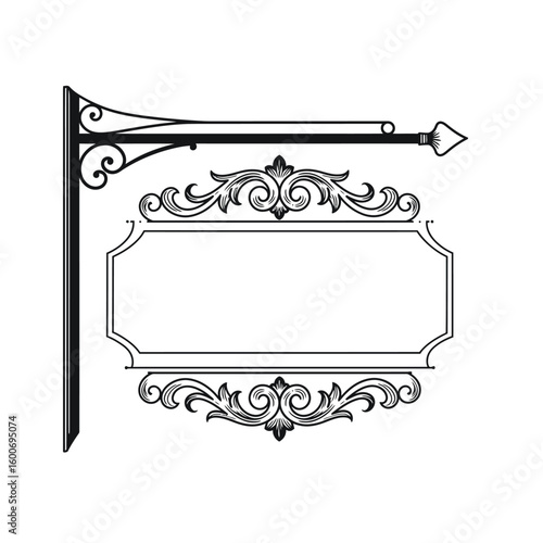 signboard, signs, vintage, ornate, decorative, frame, blank, space, vector, illustration, retro, classic, old, fashioned, scroll, flourish, elegant, design, element, border, antique, style, black, white, isolated, template, label, empty, signage, shop sign, arrow, metal, iron, wrought iron, scrollwork, victorian, engraving, engraved