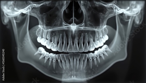 Orthopantomograph panoramic dental x-ray shows teeth, jaw bone in medical radiography. X-ray shows upper, lower teeth, jaw structure. Image for dental care, oral health awareness, dentist needs,
