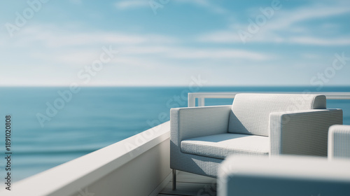 ocean view, armchair, balcony, relaxation, sea, horizon, calm, sky, coastal, contemporary, architecture, resort, vacation, travel, summer, clear sky, sunny, comfort, design, destination, copy space, tranquil, serene, hotel, apartment, upscale, exclusive, lifestyle, elegant, empty, peaceful, nobody, well-being, leisure, inspiring, beautiful, bright, minimalist, seascape, residential, living, morning