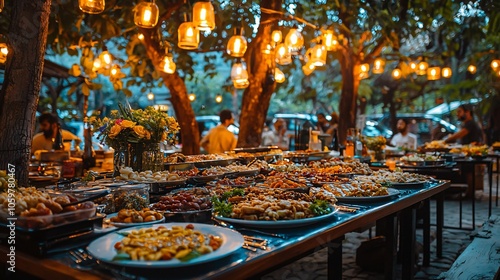 buffet, table, food, dish, string, light, canopy, night, party, gathering, dinner, widener, delicious, appetiser, banquet, feast, garden, ambience, warm, cosy, rustic, evening, celebration, social, enjoyment, togetherness, community, joy, festive, delightful, beautiful, epicure, culinary, gastronomy, life events