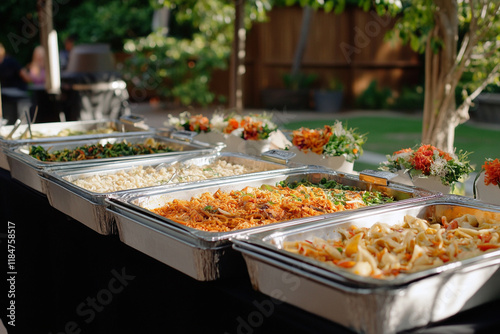 buffet, thai, catering, food, noodle, rice, vegetable, party, dining, celebration, fresh, event, serving, colourful, cookery, garden, gathering, flower, decor, setup, summer, meal, salad, delicious, feast, banquet, platter, arrangement, stainless steel, vibrant, culinary, hospitality, bright, sunny, no people