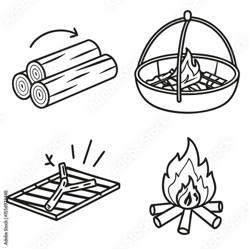 campfire, log, wood, cooking, bar-b-q, grill, camping, recreation, heat, flames, symbol, illustration, black-and-white, simple, graphic, design, element