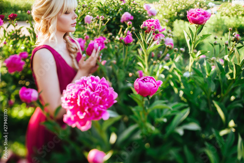 Outdoor close up portrait of beautiful young woman in the blooming garden. Female spring fashion concept