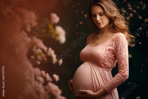 Outdoor fashion photoshoot of a pregnant woman wearing fashionable maternity clothes in a floral garden
