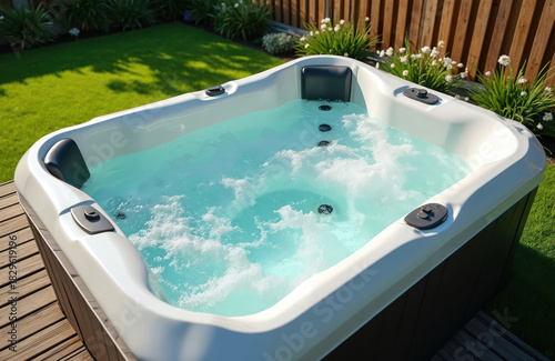 Outdoor jacuzzi in garden with clear turquoise water and bubbling jets. Hot tub is on wooden deck with green grass around. Relaxation at home resort